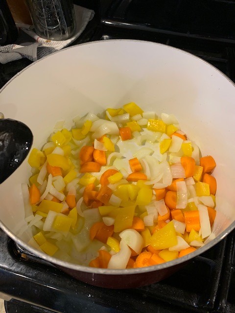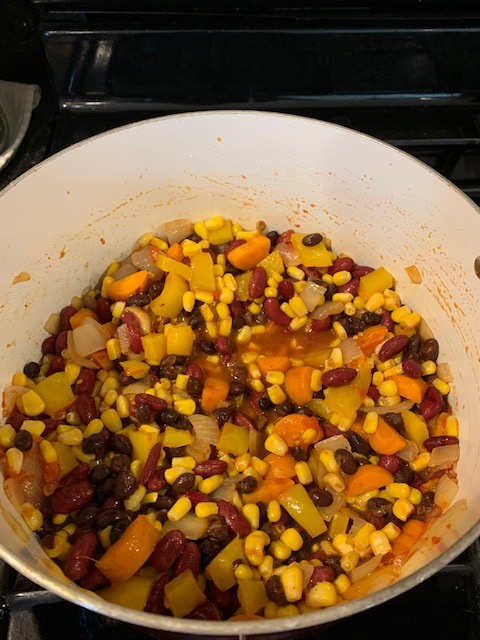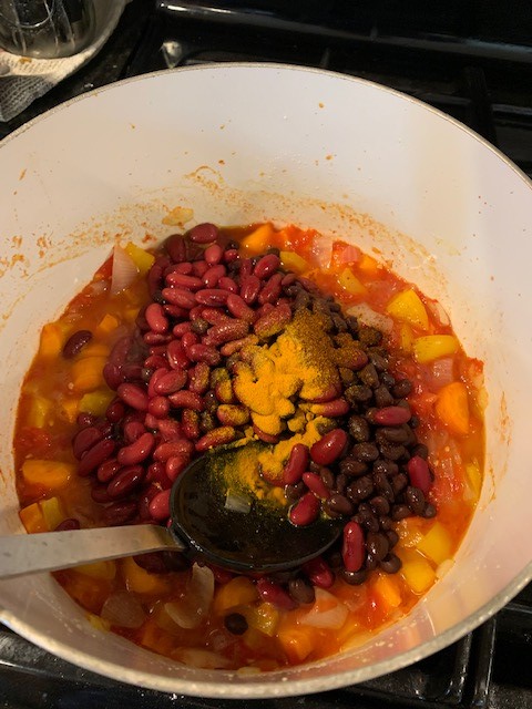 Start with 1/2 medium sized onion. Dice it and put it in a pot with olive oil over medium high heat. Dice a large green bell pepper and sauté with the onion until soft. Add 1 tsp. chili powder, 1/2 tsp. ground cumin and 1/2 tsp turmeric. Did you know turmeric is great for inflammation? It is so good for your body. It also adds a yellow color to your chili. Add some salt and pepper and swirl your spices with the onions, peppers and olive oil. Then, add 1 18 oz can of crushed tomatoes. Add a can of kidney beans (rinsed and drained) and a can of black beans (also rinsed and drained). Finally, add a small bag of frozen corn and stir until cooked through.